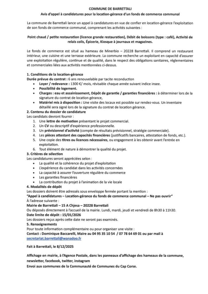 La commune de Barrettali lance un appel à candidatures en vue de confier en location-gérance l’exploitation de son fonds de commerce communal, comprenant les activités suivantes :