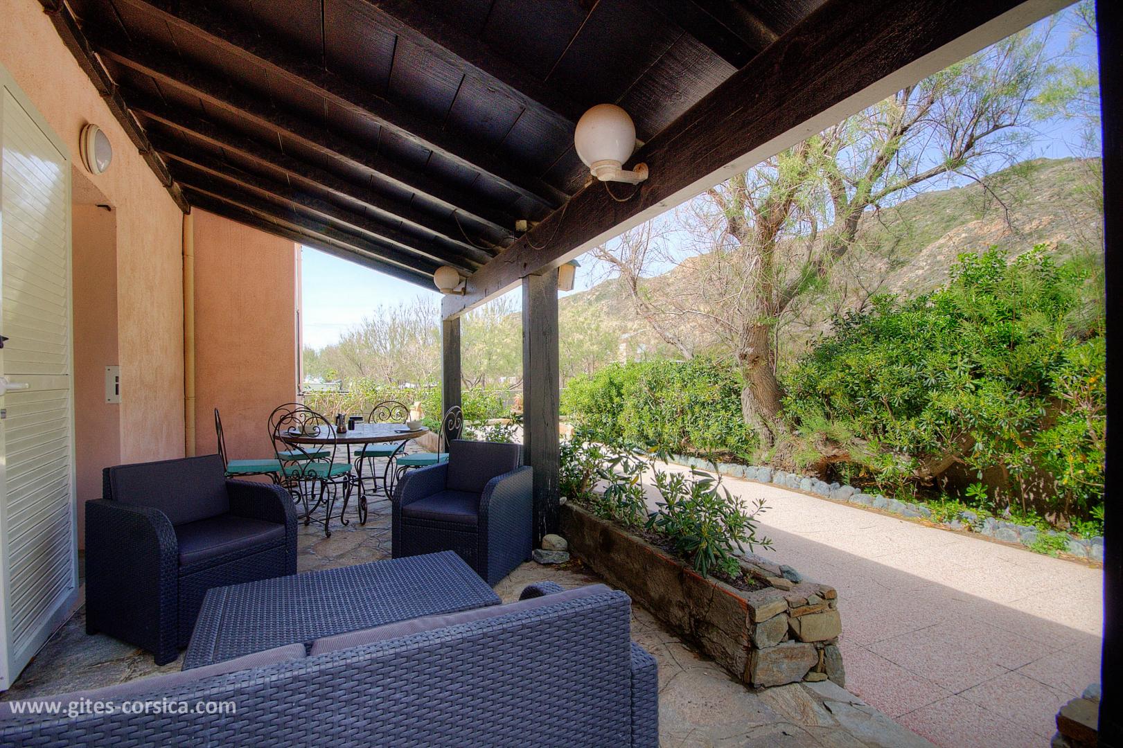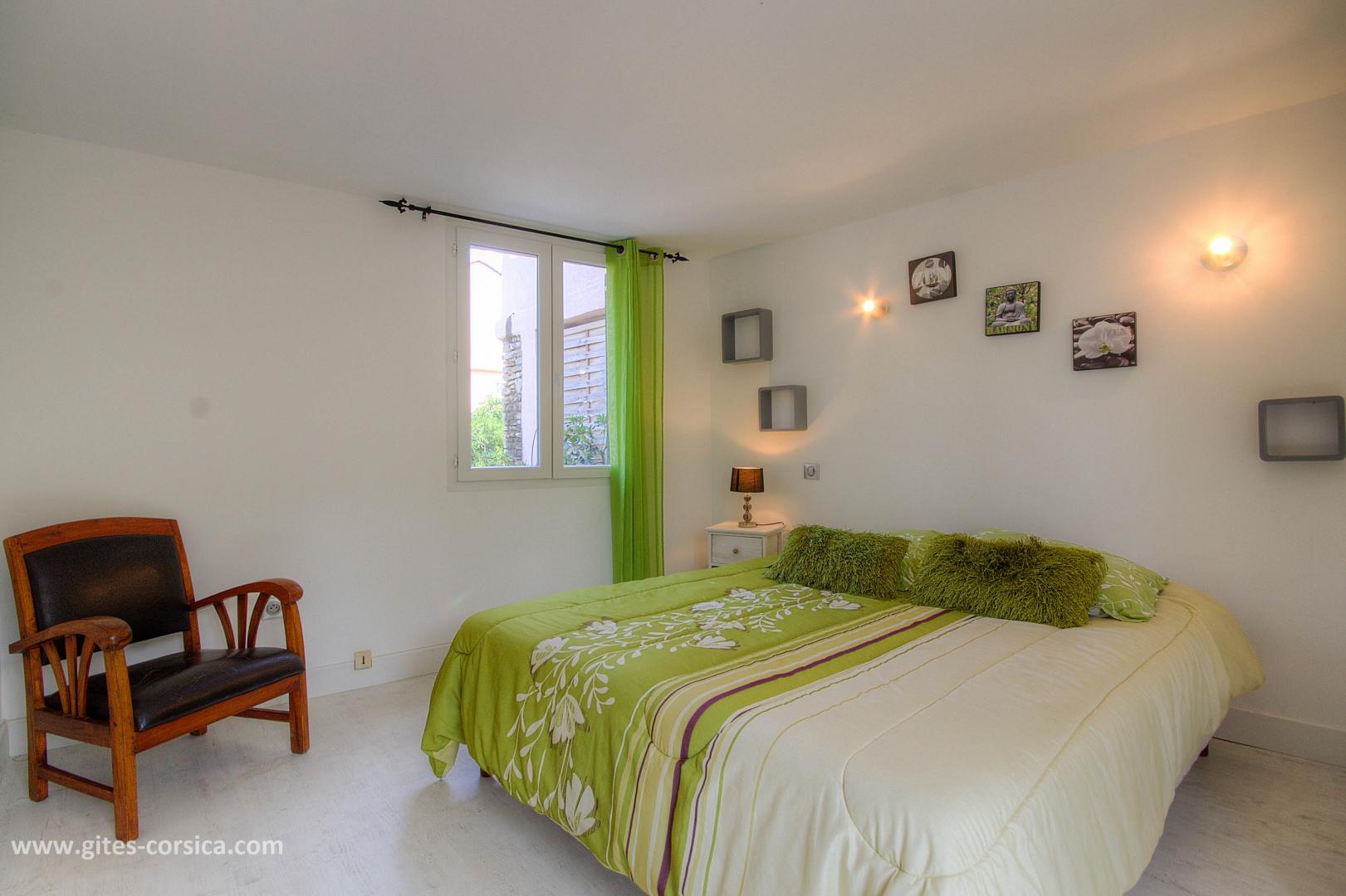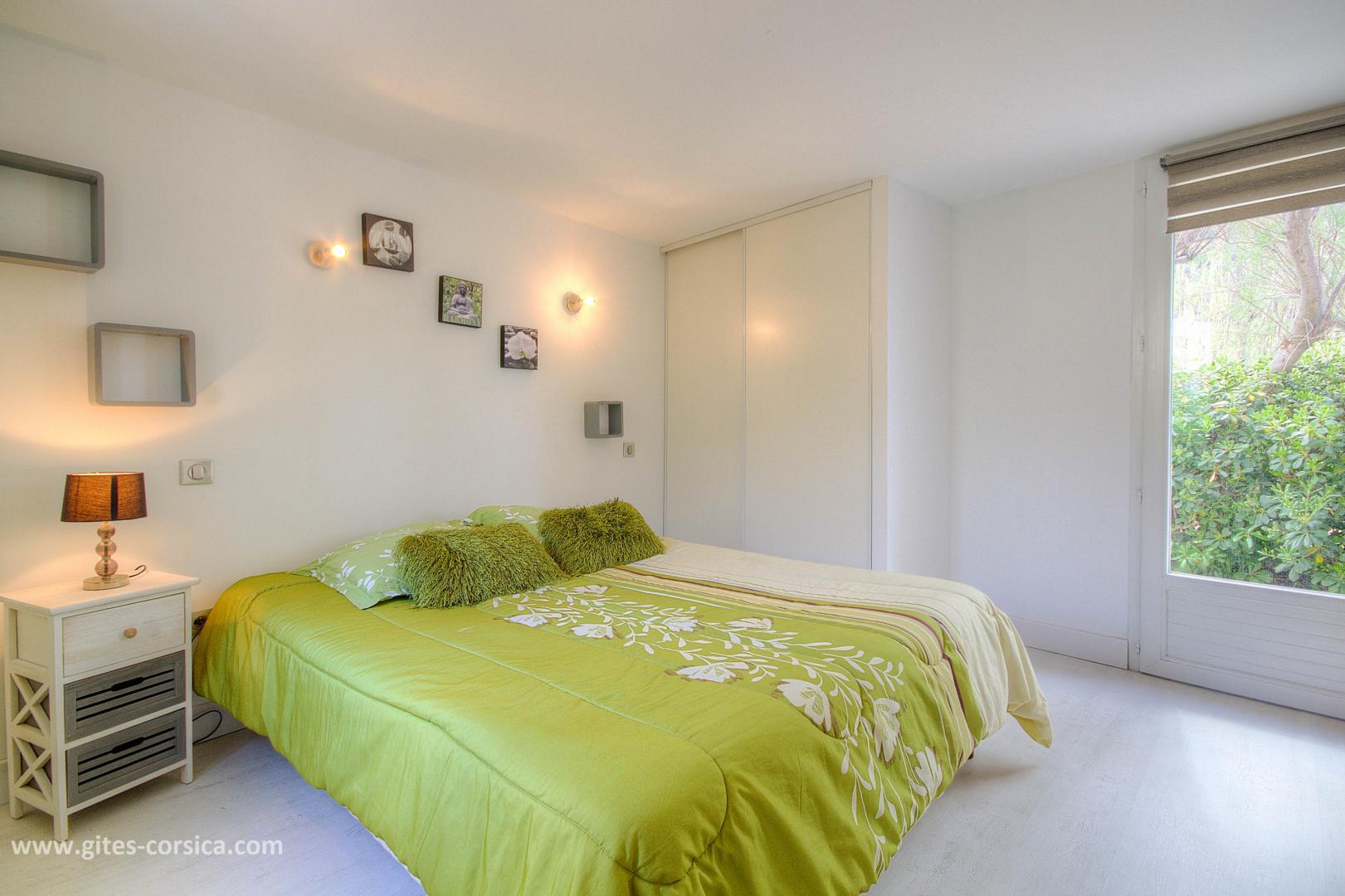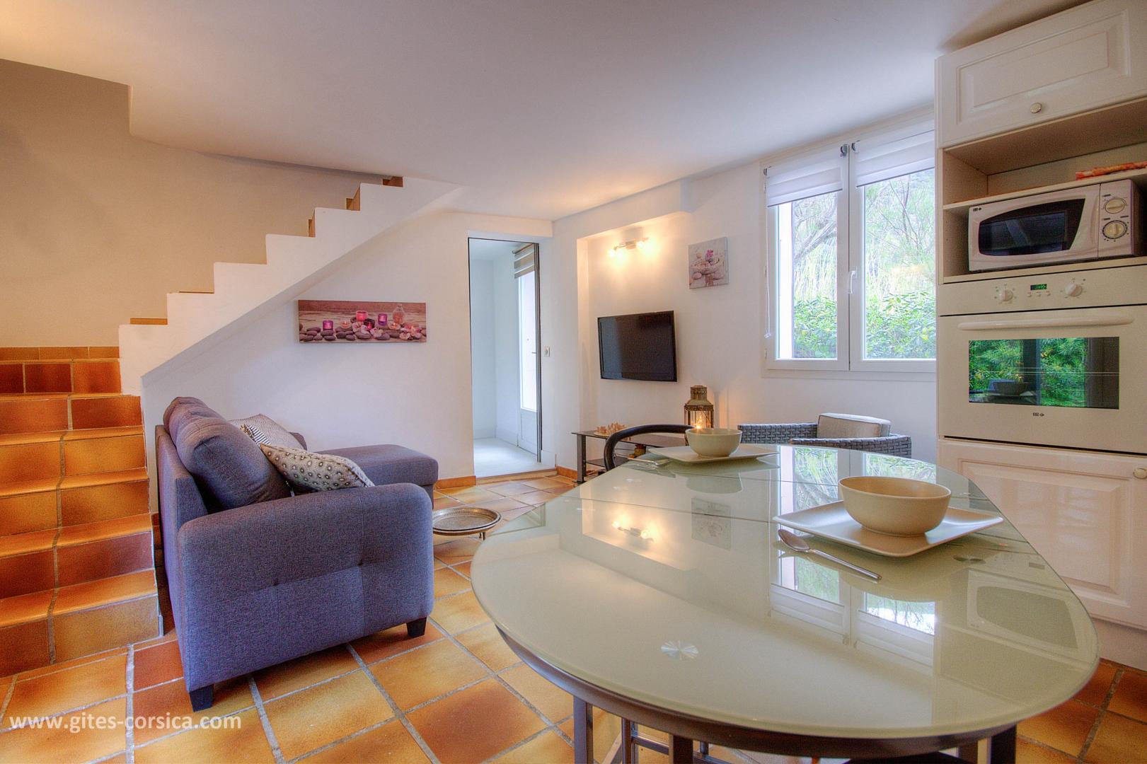 À 100 mètres de la plage et du petit port de Giottani, appartement de 58 m² mitoyen à d'autres gîtes, et à proximité de la maison des propriétaires et du gîte 61281. Il est composé ainsi :