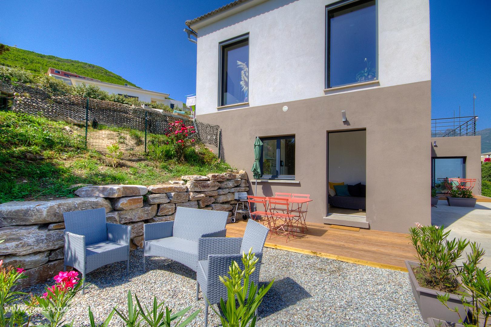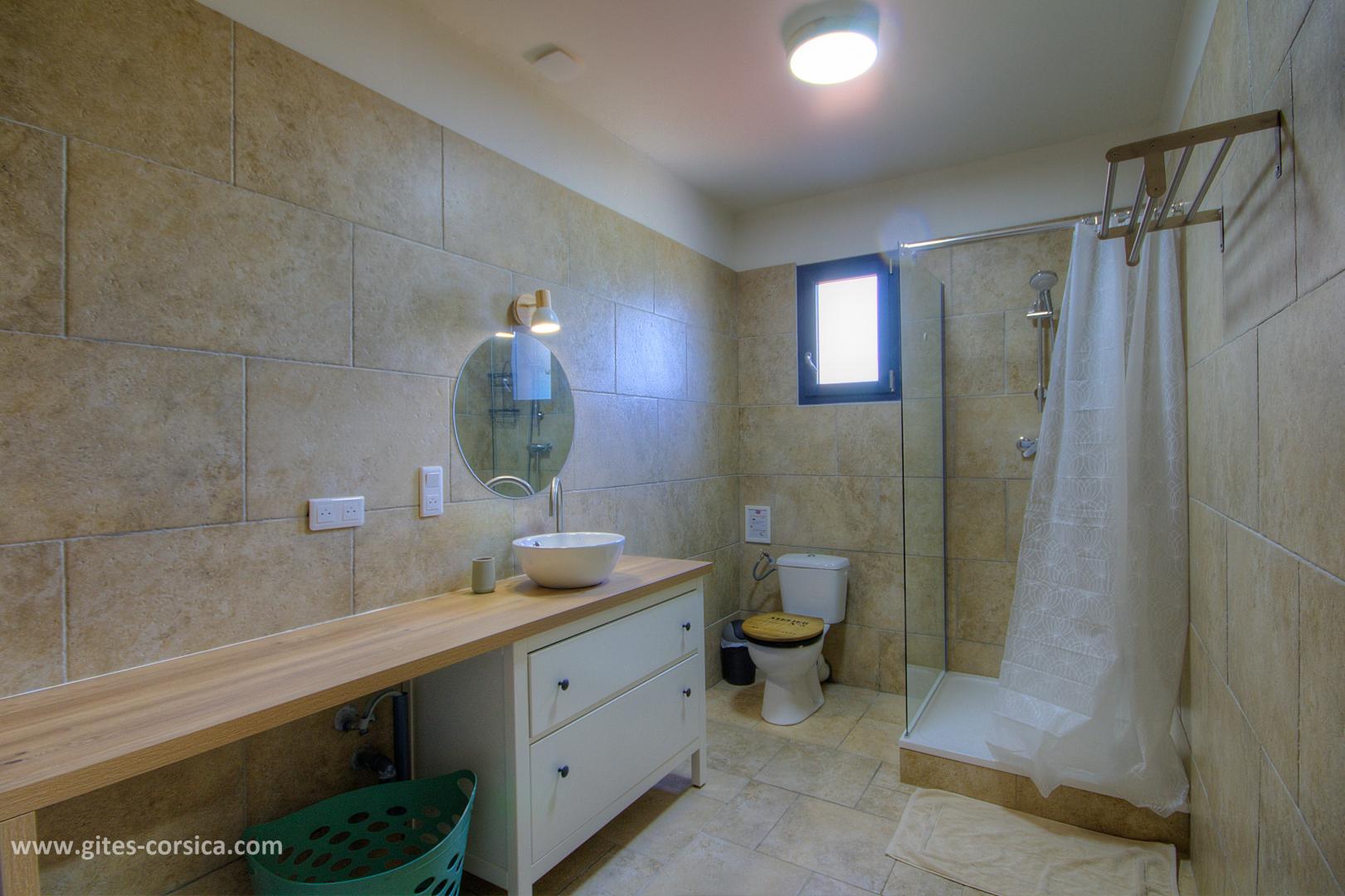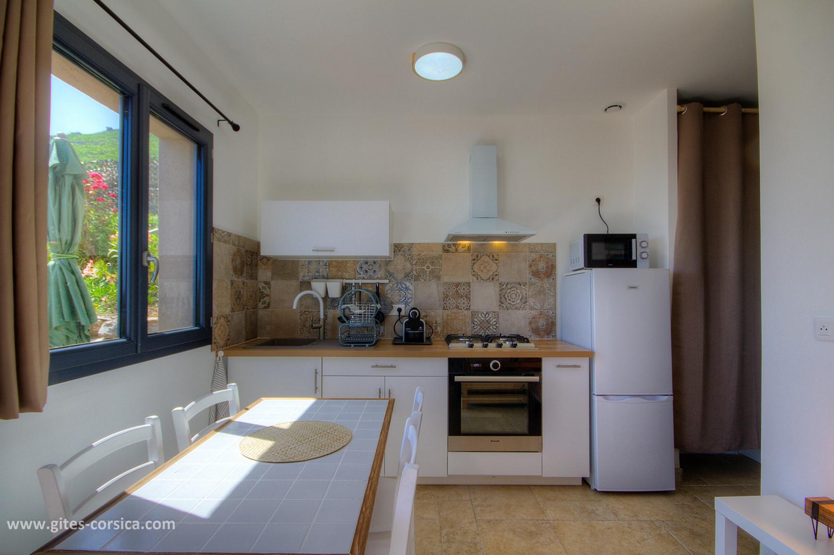 Sur les hauteurs de Sisco, à 600 mètres de la plage, gîte de 37.1 m² au rez-de-chaussée de la maison des propriétaires qui comprend également le gîte n°63382. Il est composé ainsi :