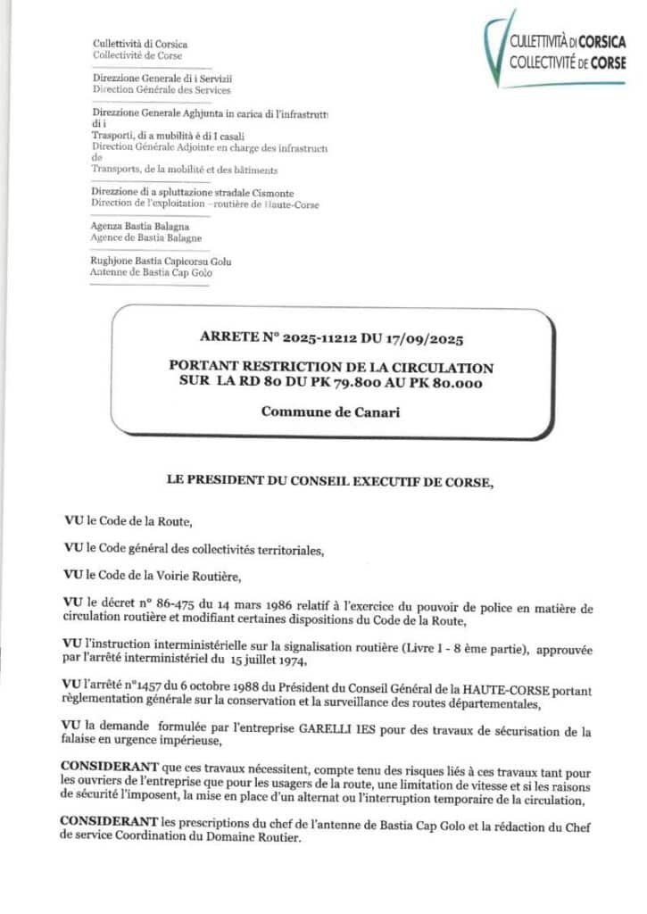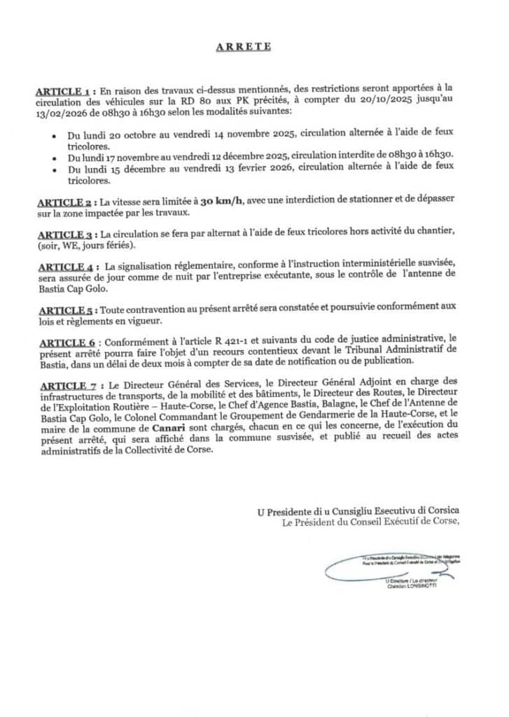 Des travaux de sécurisation de falaise entraînent des restrictions de circulation sur la RD 80 entre Canari, Ogliastro et Nonza, du 20 octobre 2025 au 13 février 2026, entre 08h30 et 16h30 selon les modalités suivantes :