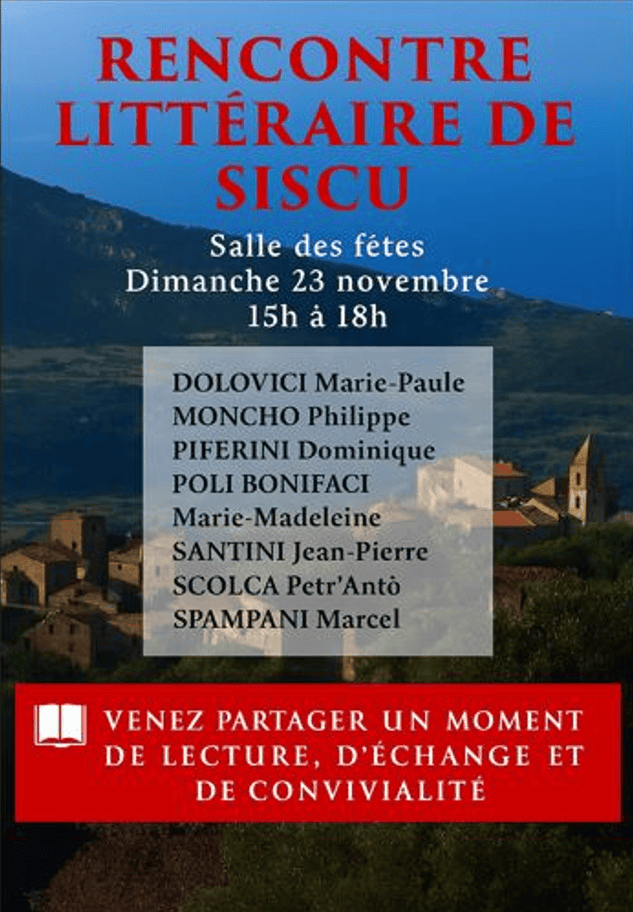 Chers amoureux de la lecture, nous avons le plaisir de vous convier à une rencontre littéraire qui se tiendra en la Salle des fêtes de Siscu, dimanche 23 novembre de 15h à 18h.